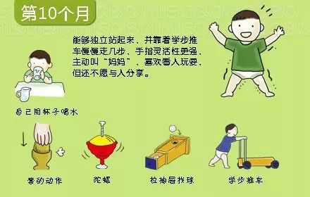能够扶物行走、手指灵活性大大增强,变得好动,能说简单的单字