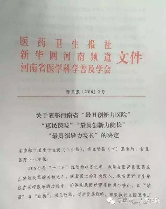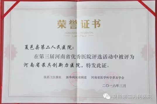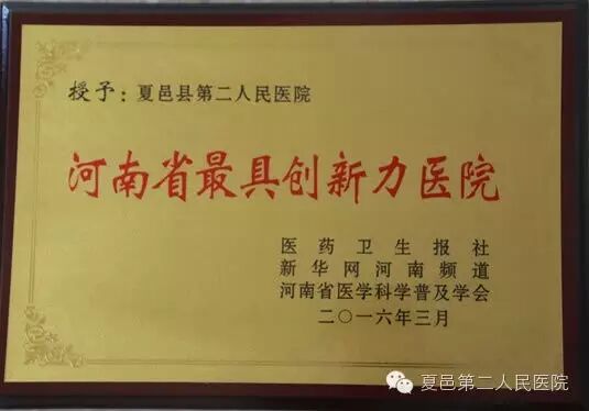 近日,医药卫生报主办评选了“河南省最具创新力医院”,第二人医院成为夏邑县唯一当选的二级综合医院,荣誉只代表过去,但是也充分肯定了二院人的锐意进取、开拓创新、爱岗敬业、为民服务。