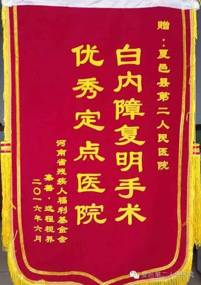 仪式上,河南省残疾人福利基金会与各合作医院签署捐赠协议并授予锦旗。活动以来,夏邑县第二人民医院为一千余名贫困家庭中的白内障患者实施复明手术,救助人数在各合作医院中位列第一,真正做到复明一人,幸福一家,温暖一片,利在患者,功在社会。 为解决老百姓看病难看病贵问题,尤其是五保户、低保户,我院特开展贫困白内障患者复明工程大型公益活动,截止目前共治愈白内障患者一千余例,送医下乡百余次,最高时一天手术49例。 夏邑县第二人民医院开展免费治疗白内障活动受到社会各界和广大患者的一致好评。